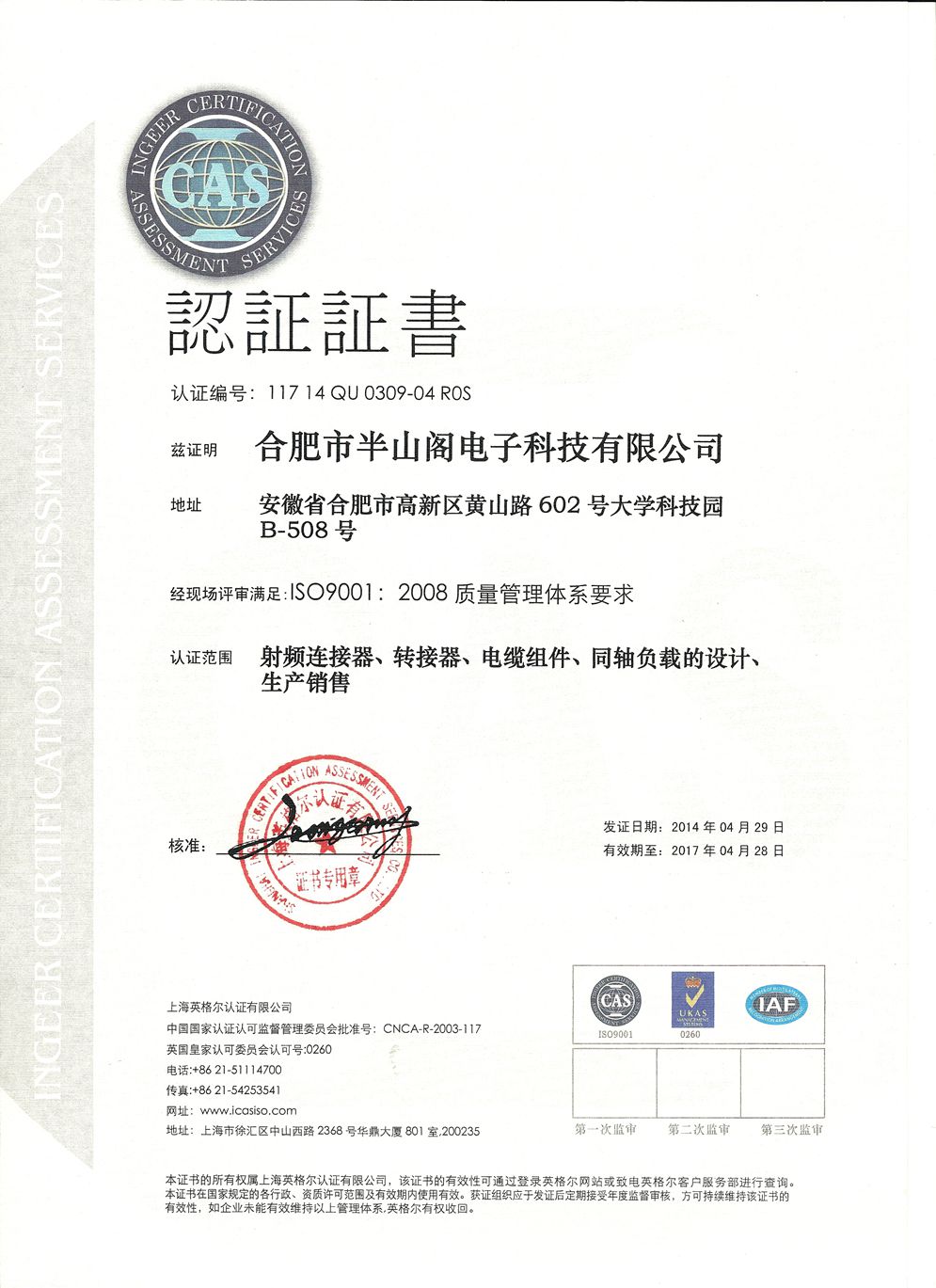 2014年3月份,公司申请ISO9001-2008质量体系认证,经过认证小组的严格审查和评审,一致认可半山阁电子的质量过程控制,满足ISO9001-2008质量体系要求并颁发证书,证书编号117 14 QU 0309-04 ROS;认证范围为:射频连接器、转接器、电缆组件、同轴负载的设计、生产销售。